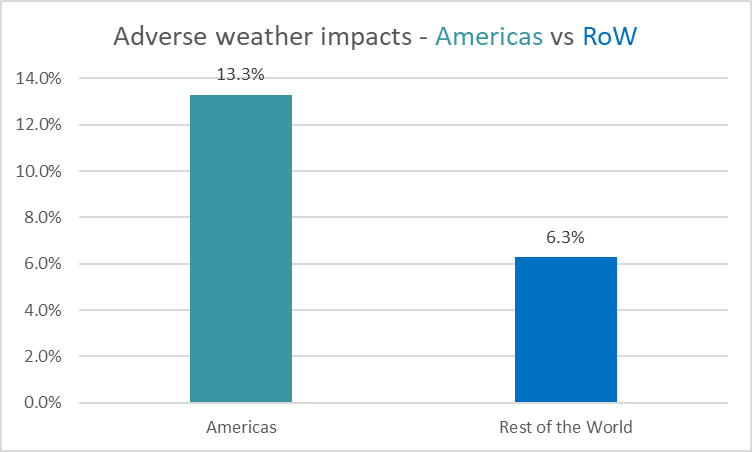 The CRUX dataset tracks capital and infrastructure projects over the last seven years. In that time, extreme weather events caused conflicts on more than one in seven (13.3%) of all projects in the Americas – seven percentage points higher than in the rest of the world. (Figure 2)